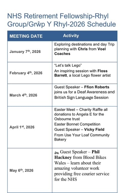 About usWe’re a friendly, informal group of retired and partially retired NHS staff who meet monthly at Rhyl Rugby Club. Our get-togethers include guest speakers, outings, laughter, and the occasional adventure – no bosses, no agendas, just fun and friendship. We also run our popular ‘Eggs & Legs’ sociable strolls and breakfast banter, where you can join a gentle flat walk or simply meet us in a local café for a cuppa and chat.